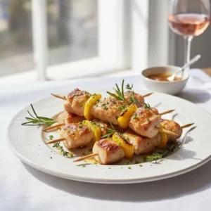 Découvrez cette délicieuse recette de brochettes apéritives de dinde marinée au citron qui ravira toute la famille. Un plat savoureux prêt en seulement 45 minutes, parfait pour 4 personnes.