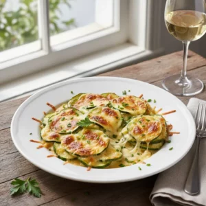 - Dans un saladier, mélangez les courgettes, la crème fraîche, le mélange oignon-ail, la muscade, le sel et le poivre. Si vous aimez, vous pouvez goûter et rectifier l’assaisonnement — allez, soyez gourmand !