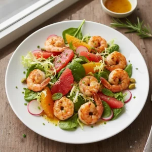 Recette de salade fraîcheur aux agrumes et crevettes, touche de menthe facile et rapide. Prête en 50 minutes pour 4 personnes. Ingrédients simples, résultat délicieux. Testée et approuvée ! ⭐