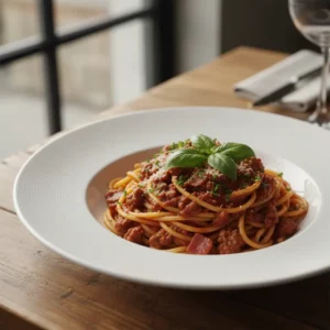 - Servez les spaghetti nappés de sauce bolognaise et saupoudrez de parmesan râpé. Petit conseil: un peu de basilic frais ou de persil peut ajouter une touche de couleur et de fraîcheur.