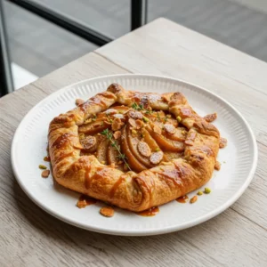- Pelez les poires, coupez-les en fines tranches. Enfilez votre casquette d’artiste et disposez-les joliment sur la pâte en cercles concentriques.